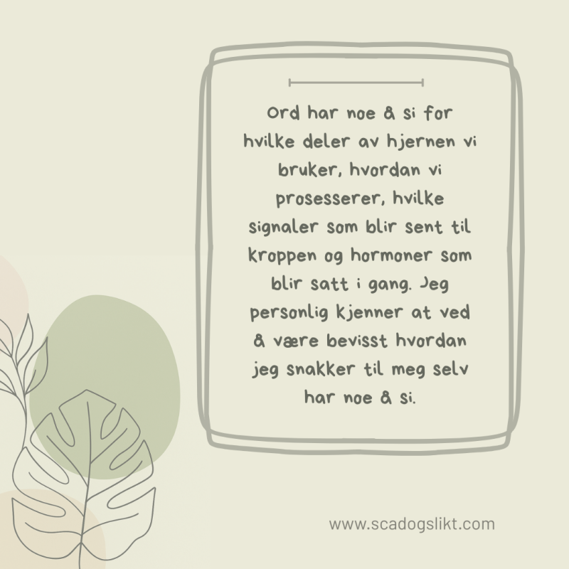 Og en ting som faktisk hjelper for meg på en underlig måte, er at jeg har oppdaget at når jeg tenker på trening – tenker jeg på et fast sett med aktiviteter. Det jeg har gjort hele livet. Når man tenker på hva trening er – kommer det automatisk opp et bilde av et visst sett av aktiviteter. Det som innebærer blodsvette og vekter på gymmen eller slitsomme løpeturer. Men dersom jeg slutter å tenke at jeg skal trene, og begynner å tenke at jeg skal være i aktivitet. Så hjelper det! Det føyer seg bare inn som et argument for det jeg begynte med. At disse tingene er biologi. Ord har noe å si for hvilke deler av hjernen vi bruker, hvordan vi prosesserer, hvilke signaler som blir sent til kroppen og hormoner som blir satt i gang. Jeg personlig kjenner at ved å være bevisst hvordan jeg snakker til meg selv har noe å si. I stede for å starte dagen med «nei i dag klarer jeg virkelig ikke å dra på trening fordi….», starter jeg dagen med «hvilken aktivitet vil jeg gjøre i dag….» og det gjør i alle fall stor forskjell for meg!