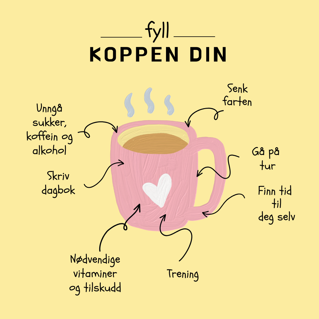 Det ene er at sukker, koffein og alkohol bare må kuttes fullstendig ut i disse periodene. Det hjelper på ingen måte! Videre er det å opprettholde trening viktig, selv om det er det siste jeg vil gjøre ettersom de fysiske plagene jeg opplever i denne perioden virkelig slår meg ut. Det handler om å hjelpe kroppen med dopamin, og eliminere en del adrenalin. Søvn er vanskelig i denne perioden, så det er ekstra viktig å legge til rette for å forsøke å få god nok kvalitet på søvnen og nok av dette! Jeg er så trett og utmattet at det er nødt til å være en prioritet. Jeg passer på å ta tilskuddene og vitaminene jeg vet jeg har mangler på i perioder og som er bra for meg. Og det siste, som egentlig kan være aller mest vanskelig, er at jeg for alt i verden må forsøke å unngå stress og prøve å få til nok alenetid for å gi meg selv de små pusterommene jeg trenger for å komme meg gjennom dagen.